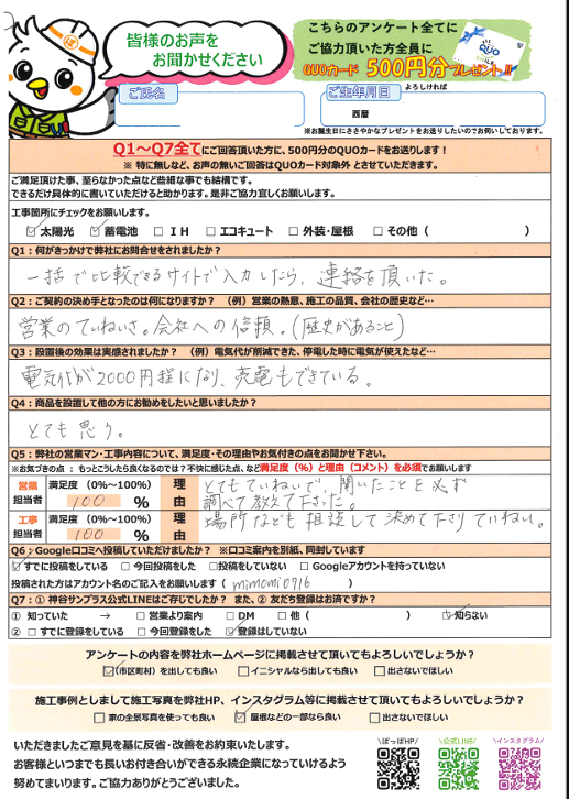 【太陽光/蓄電池】会社への信頼もあり営業さんも丁寧で安心してお願いできました。