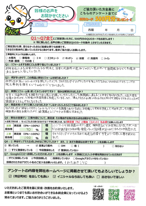 タカラスタンダード越谷レイクタウンショールームでイベントを開催されているときにお邪魔して実物を拝見して決めました。その際に補助金のお話をお聞きしたので給湯器とレンジフードの交換も決めました。