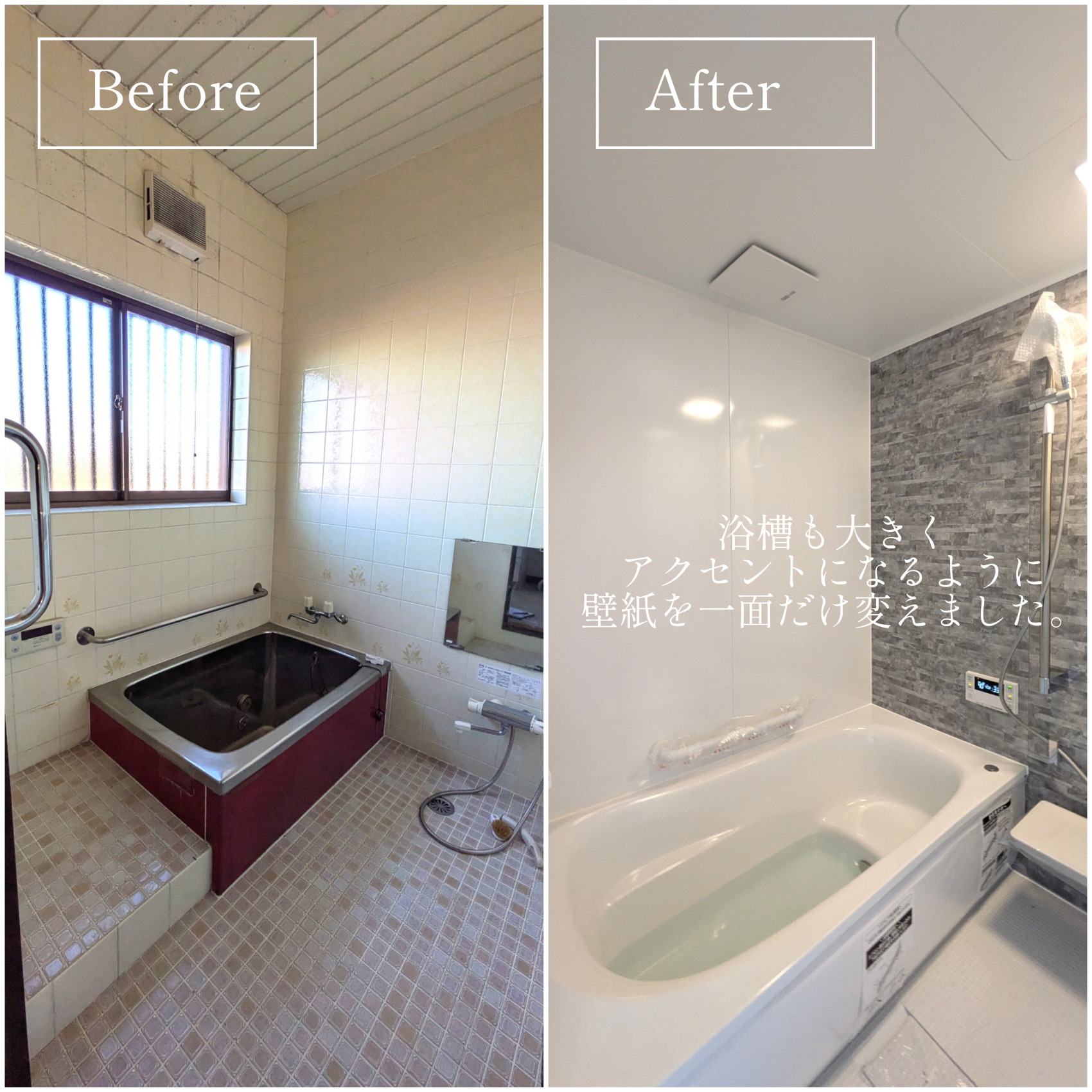 浴槽も大きくゆったり浸かれるお風呂に!真っ白な浴槽とアクセントに一面だけ壁紙を変えおしゃれな浴室になりました。