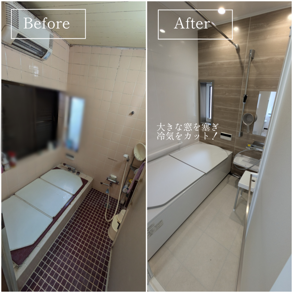 以前の冬場の浴室は大きな窓からは冷気が入り、タイルの床は冷たく、段差で危ない思いも、、、