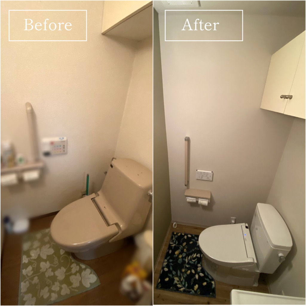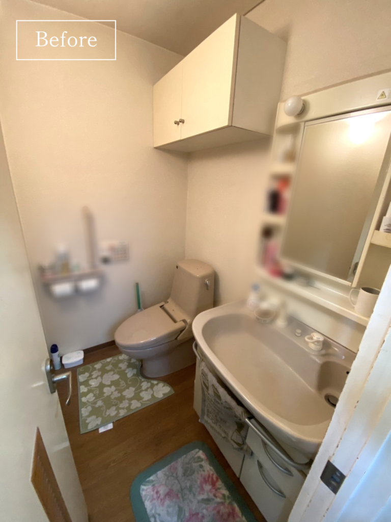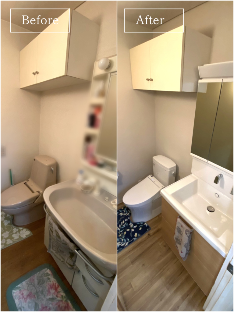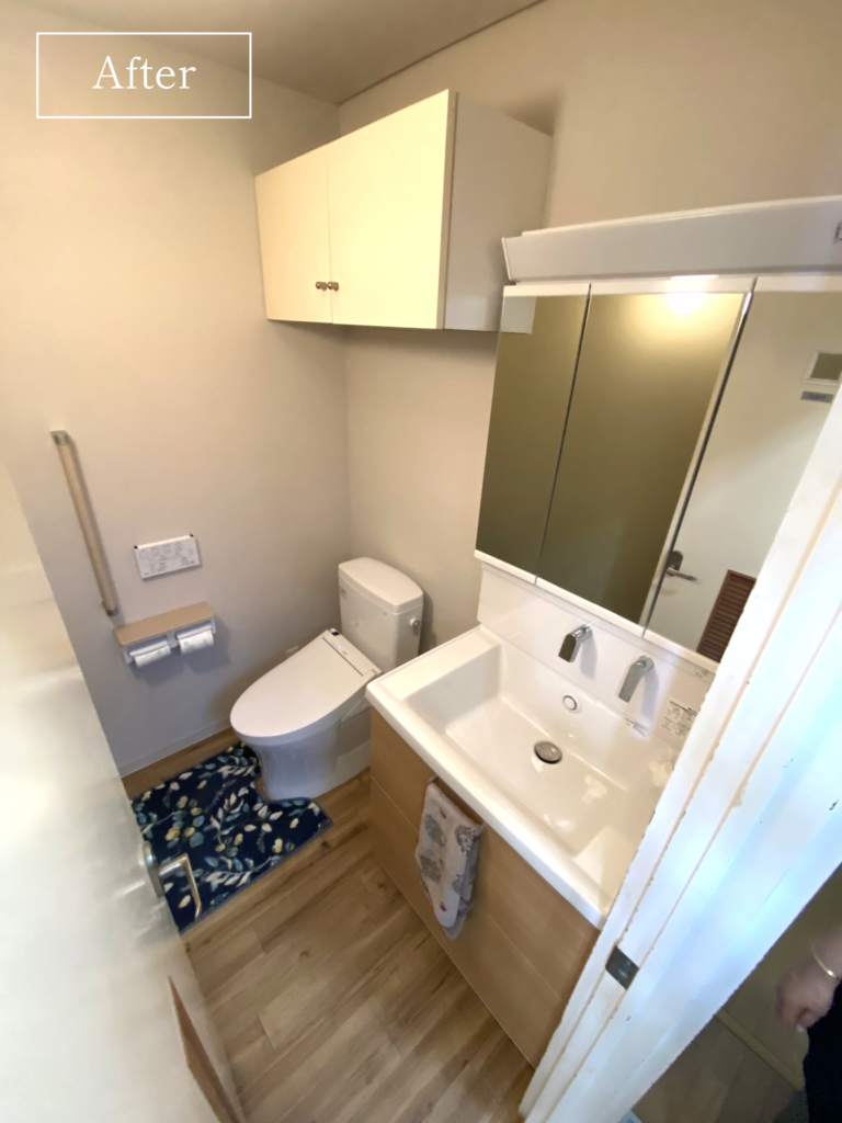 トイレはベーシックなものに変更、トイレ上の収納もそのまま生かしで予算を抑え、洗面化粧台は既存の物より少しグレードの高いものに変更しました。3面鏡にすることで収納力は上がり、物が見えなくなりスッキリと。床・壁も張り替えて見た目も雰囲気も変わりました。