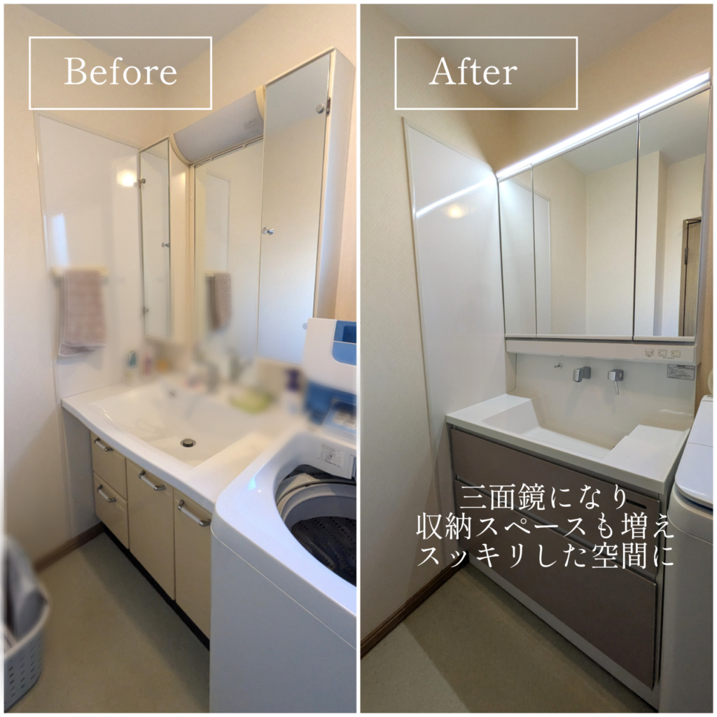 以前の洗面化粧台は使ったあと水栓の周りに水が溜まって見た目も掃除も大変、磨いても落ちず不満がありました。ハイバックタイプのすっきりしたデザインの水栓で見た目もスッキリしとタカラスタンダードのホーロー素材で汚れがつきにくく、水拭きだけで簡単に掃除できます。また3面鏡の収納や、引き出しタイプのキャビネットなど、整理しやすくスッキリきれいな洗面化粧台スペースになりました。