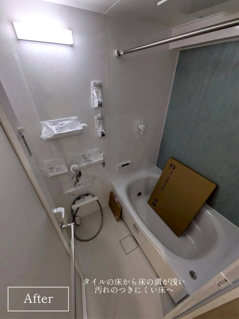 目地が多く、どうしても汚れが入り込みやすくお掃除するのが大変でした。マンション用システムバスリノビオVシリーズ Fタイプへリフォーム。キレイサーモフロア、床の溝が浅く、汚れが付きにくい。冷たさを感じにくい素材。毎日のお風呂が居心地よくなりました。