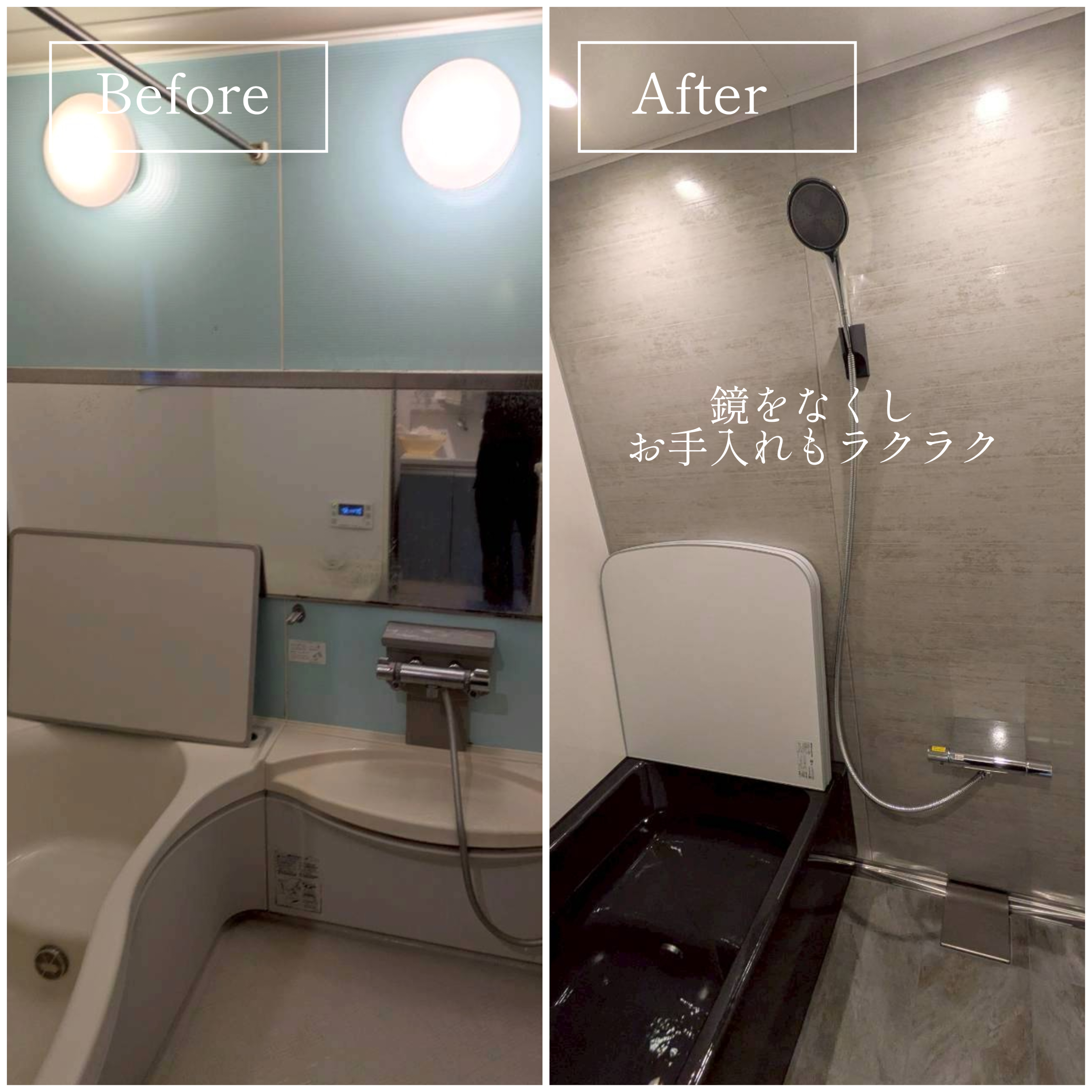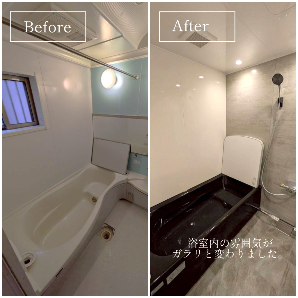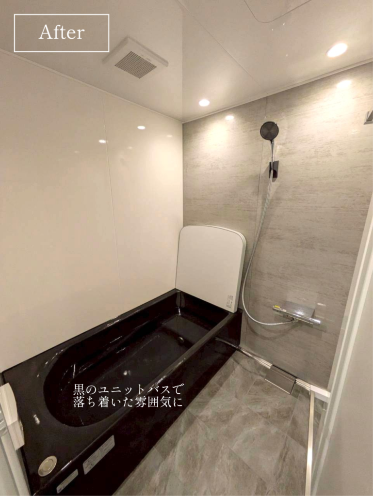 「暖かくしたい」「お掃除を楽にしたい」とのご要望をいただき、タカラスタンダードのプレデンシアをご提案。保温性の高い浴槽と断熱性のある浴室で、冬でも暖かく快適!浴槽を黒色に変更し浴室全体の雰囲気が引き締まり、落ち着いた高級感のある空間に仕上がりました。さらに、鏡をあえて設置しないことで水アカ汚れの掃除が減り、お手入れもラクラクに!窓も塞いだことで断熱性が高まりより暖かい浴室になりました。