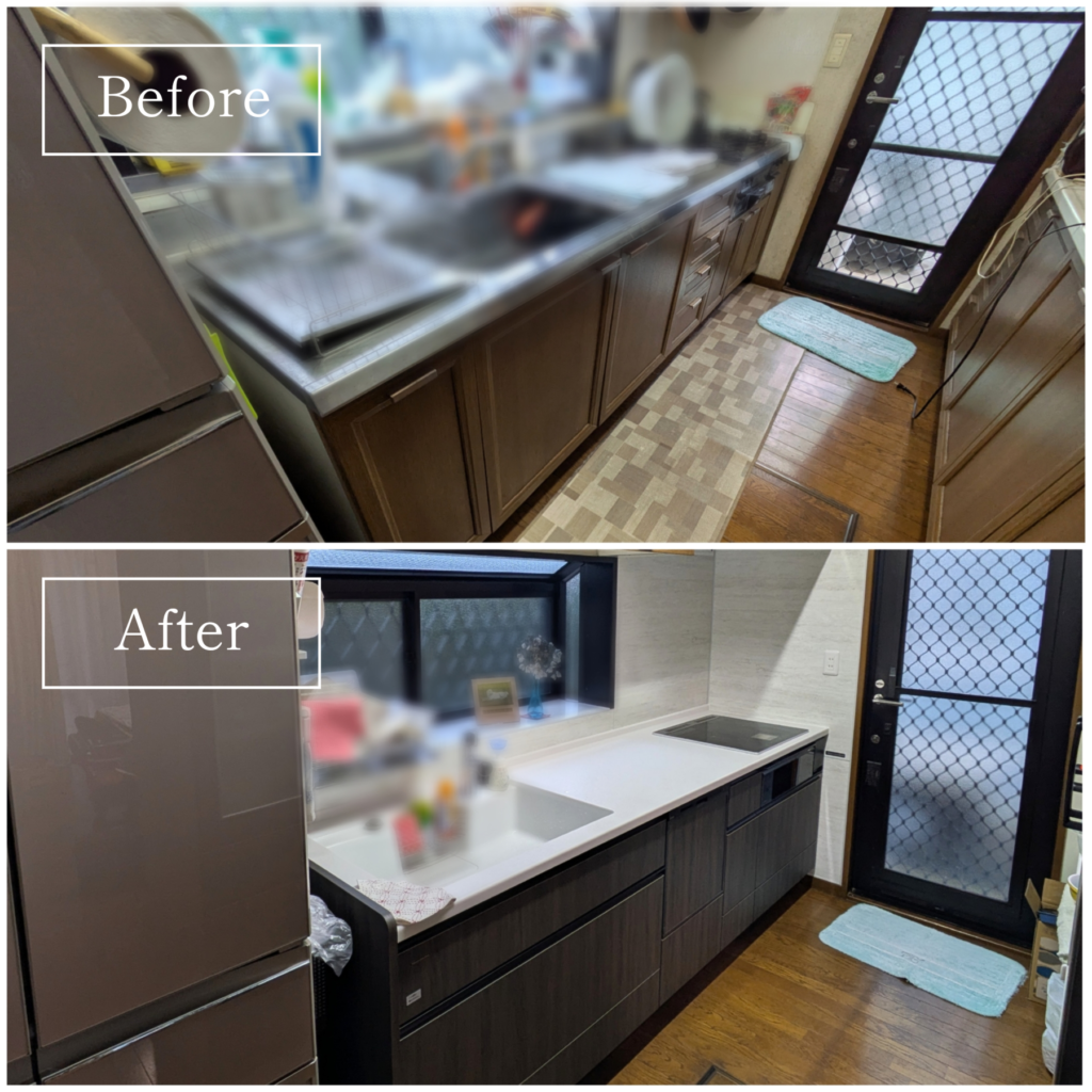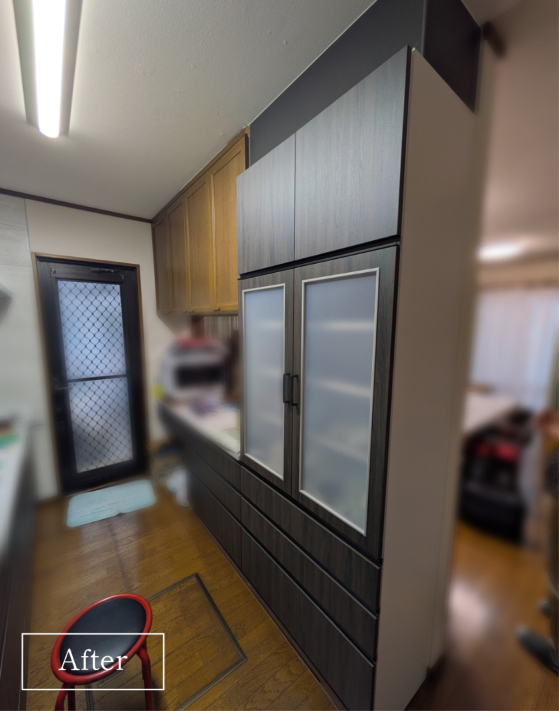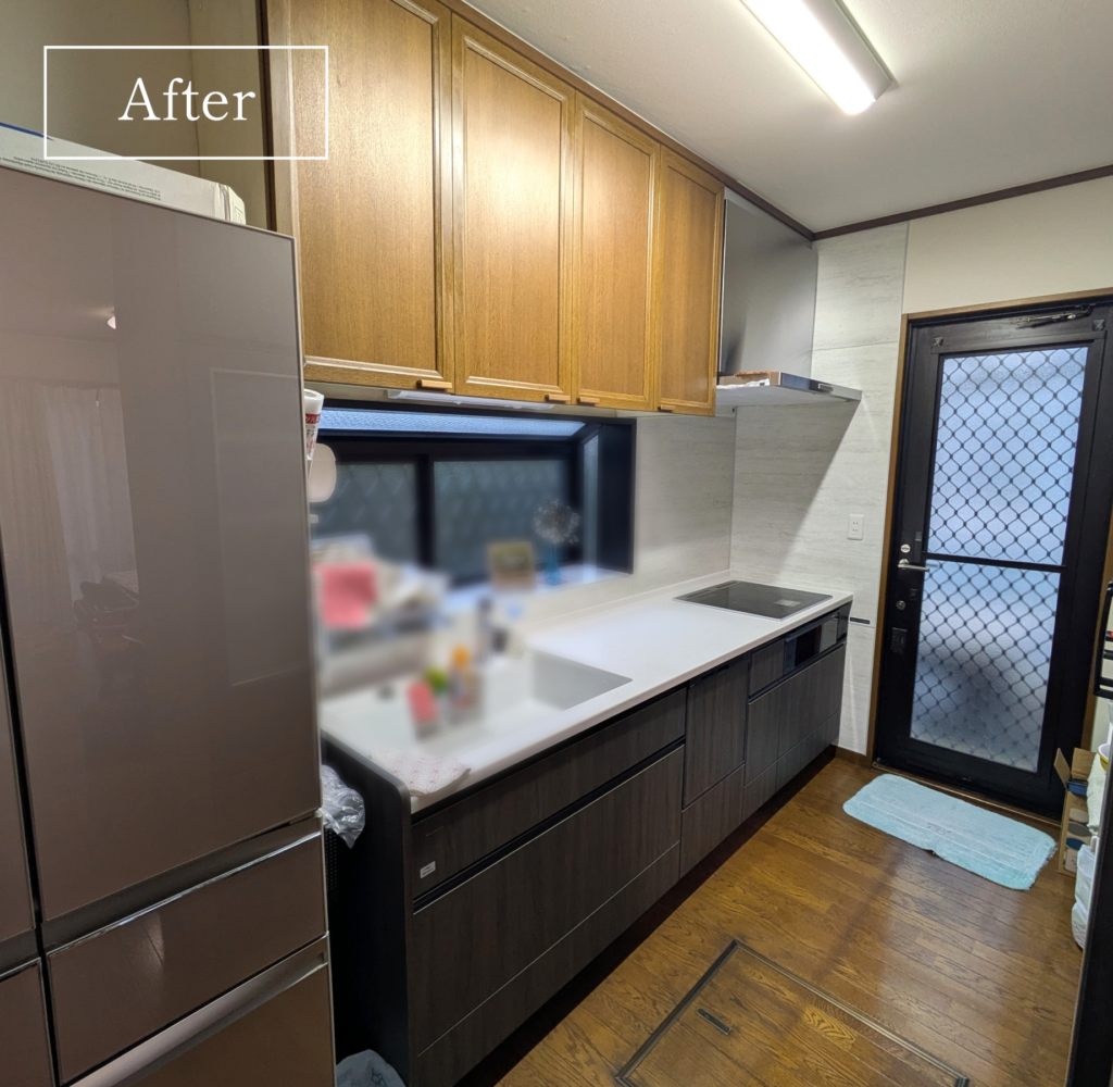 キッチン上の戸棚はそのまま活かし、キッチン本体のみを交換しました。タカラスタンダード「リフィット」をご提案。コンロはガスコンロからIHへ変更し、汚れもサッと拭くだけ。お掃除がぐっとラクになりました。また、収納は開き扉から引き出しタイプへ。奥までしっかり使えるためこれまでより収納力が大幅にアップ。さらに食器棚もキッチン全体の新しくして収納力がさらに向上。毎日使うキッチンが、使いやすく家事がラクになる空間に生まれ変わりました。